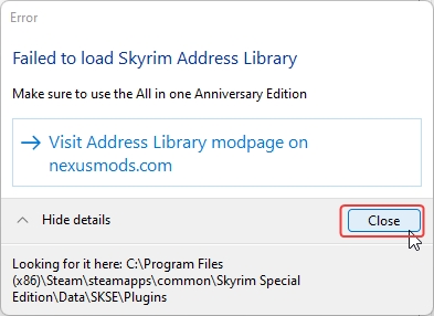 7. It may display an error like this, but you can safely disregard it by pressing Close. It's looking for the Address Library for the SKSE mod, but that won't be loaded until the game starts.