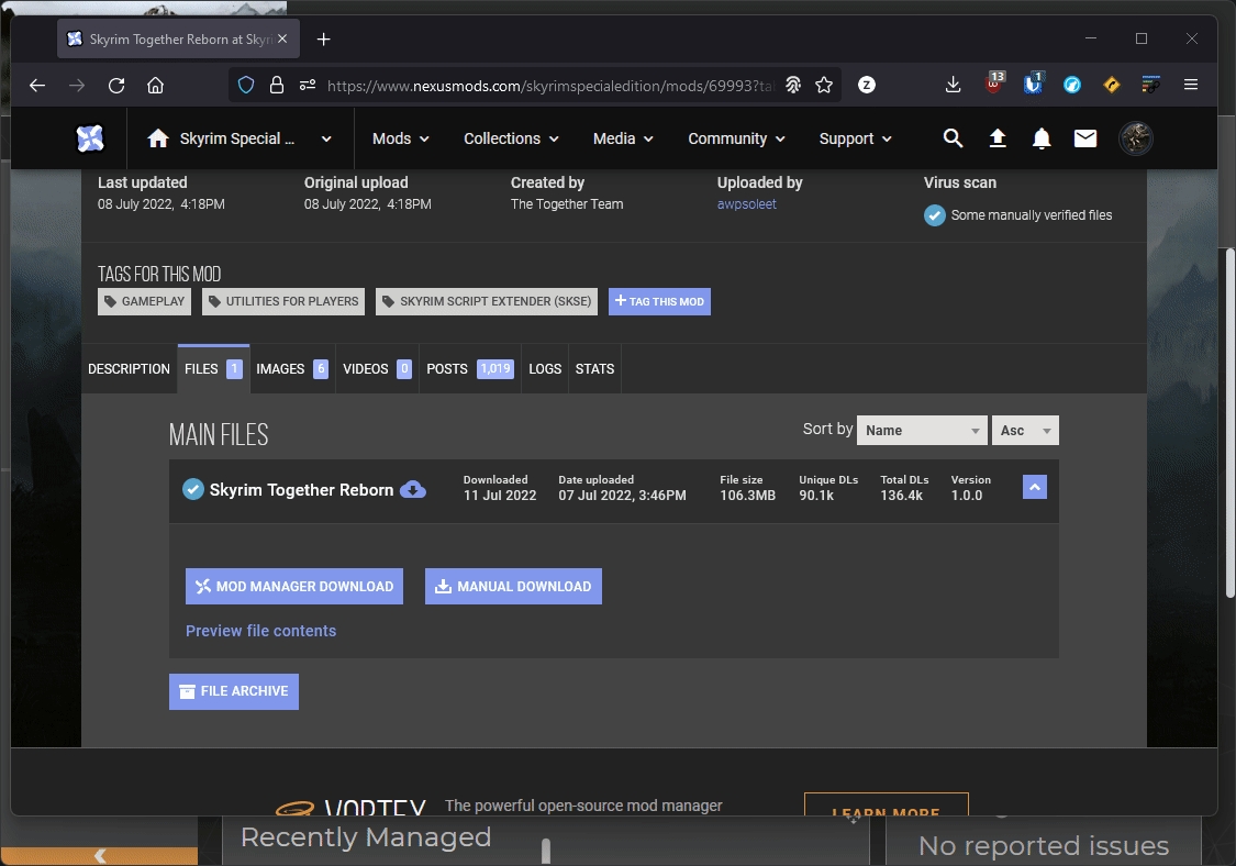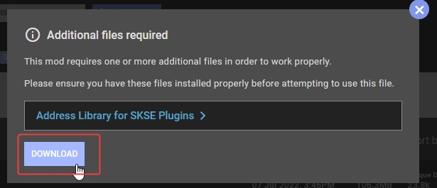 Address Library for SKSE Pluginsis required. However, we have already downloaded that, so click theDownloadbutton.Depending on whether you're logged in to NexusMods or not, it may look like this: