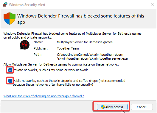 SkyrimTogetherServer.exeA firewall popup will show mark, mark it both allowed for both private and public networks.